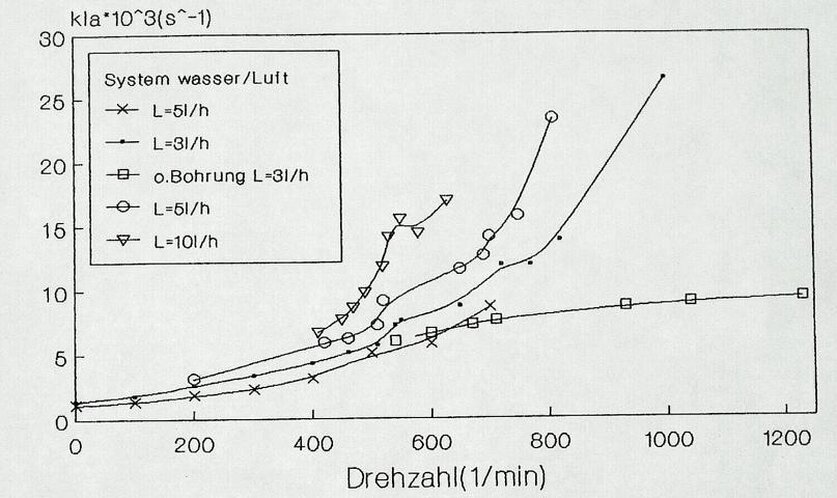 Den Stoffübergang von Sauerstoff in Wasser zeigt (Bild 4). In der Darstellung ist erkennbar, dass der volumetrische Stoffübergangskoeffizient (kla-Wert) bei einer bestimmten Drehzahl sprunghaft an steigt. Es handelt sich dabei um die Drehzahl, beider die Blasen durch die Perforationen an den Scheibenrändern hindurchtreten.