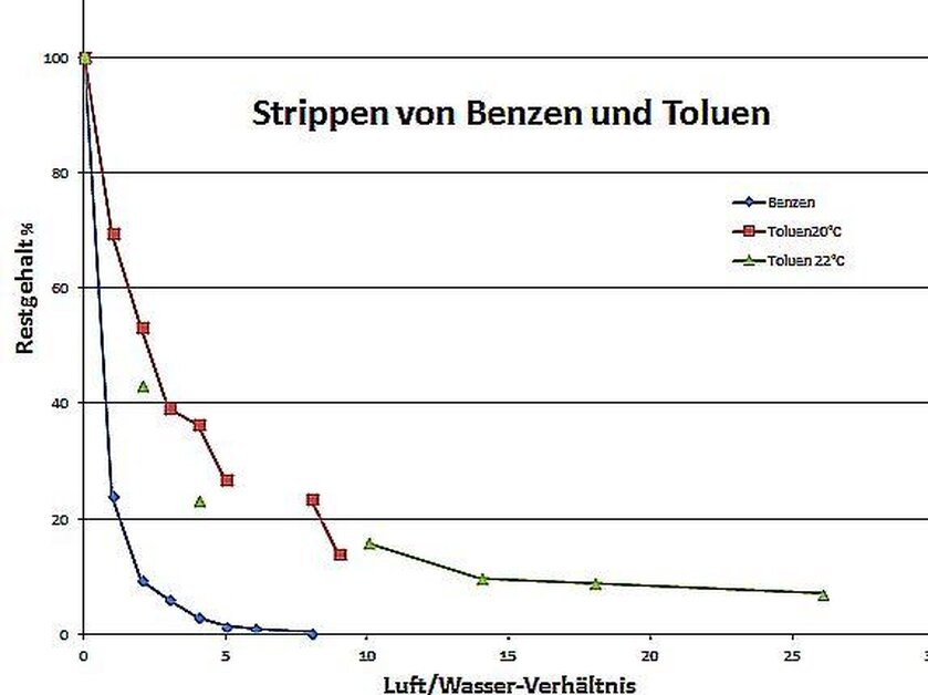 Das theoretische Luft- Wasser-Verhältnis, das erreicht wird, wenn die Luftvollständig mit dem Schadstoff gesättigt ist, beträgt für Benzol 8,6 :1 und für Toluol 15:1. Ähnlich günstige Ergebnisse erhält man bei der Entfernung von LHKW.
