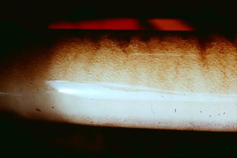 In Drehzylinderapparaten lassen sich wie bei der Rohrströmung die verschiedenen Strömungsarten – laminare Strömung, Wirbelströmung und Turbulenz - in Abhängigkeit von der Drehzahl erzeugen und bestimmten, charakteristischen Bereichen der Taylorzahlen zu ordnen. Die laminare Strömung lässt sich nur sehr schwer beobachten und hat bisher wenig Beachtung erlangt. Das größte Interesse haben die Taylorwirbel gefunden, die sich im Übergangsgebiet zwischen der laminaren und der turbulenten Strömung ausbilden. Sie sind leicht zu beobachten und gut reproduzierbar zu erzeugen. Die Strömung innerhalb der Taylorwirbel ist laminar. Bei Steigerung der Drehzahl werden sie instabil. Diese Instabilität zeigt sich in einer Welligkeit der Wirbelgrenzen, die die Existenz einer zusätzlichen Wirbelbewegung innerhalb des Taylorwirbels anzeigt (Bild 2). Bei einer weiteren Steigerung der Drehzahl werden die Wirbelgrenzen immer unschärfer; der Übergang zur Turbulenz vollzieht sich für den Beobachter kontinuierlich und langsam.